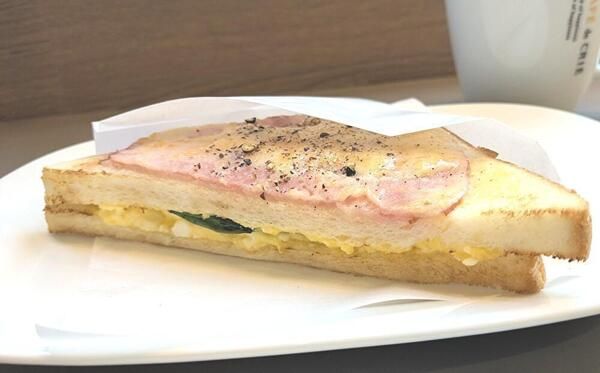 天面に旨味のあるスモークハム、コクのあるたまごサラダとほうれん草、3種のチーズをトッピングされたトーストです。