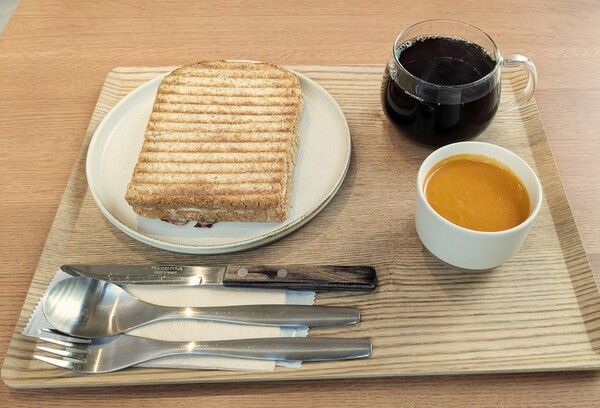 今回は「ハムチーズトースト(セット)」です。ふわふわ、もちもちのトーストにコクのあるチーズとハムの王道モーニングセットです。コーヒーはカフェインレスコーヒーも選ぶことができます。