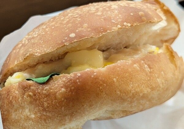 十勝産スーパースイートコーンを使用したまろやかでコクのあるコーンクリームと旨味のあるツナサラダをサクもち食感のフォカッチャに挟んで焼き上げたホットサンド。