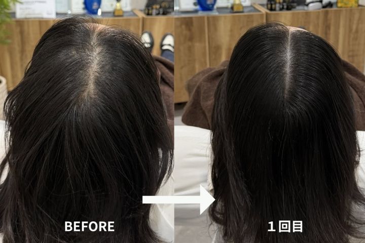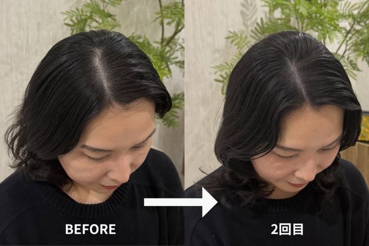 1ヶ月後、2回目の施術で全体の7割ほどが完成。ビフォーの寂しげな分け目が、完了後はギュッと密集した健康的な地肌へ♡今回は1.5時間程度の施術時間でした。