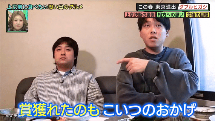 そんな大好きな先輩・大東の「東京進出をきっかけに直してほしいこと」を、ねんどは東にたずねた。なんと東は、大東に直してほしいことはなく、むしろ「マジで感謝しかしてない」とのこと。「ネタ(作り)も全部やってくれているし、賞を獲れたのも絶対こいつのおかげやし」と、東は大東を褒めまくった。