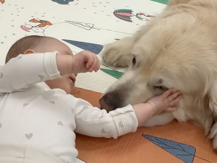 ベビーシッター犬? ハイハイ練習を見守る、ふかふかで頼もしいお兄さんワンコ