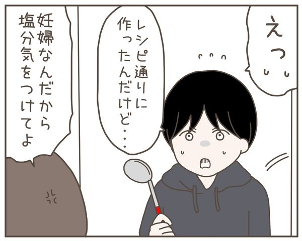 飲み会をキャンセルすると、「うれしい」とほほえむ妻。夫は「自分がもっと頑張れば」と考えますが、けっきょく、厳しい妻へと逆戻りしてしまいます。みそ汁まで作ったのに、夕飯は実家で食べると出ていくなんて…。いくら妊婦とはいえ、さすがにワガママではないでしょうか。