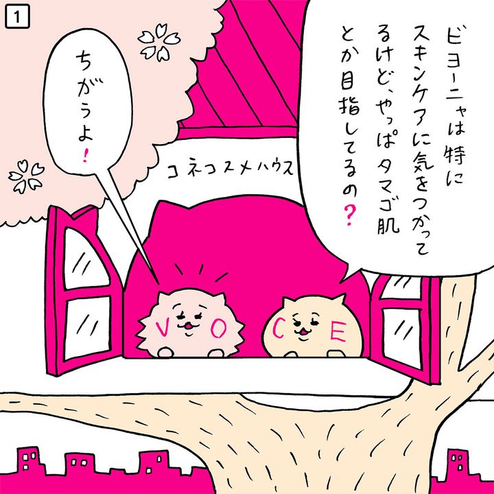 クリエイター・パントビスコさんが描いたVOCEウェブサイトオリジナルキャラクター「コネコスメ」。ピンクの子猫は美容オタクの「ビヨーニャ」、ベージュの子猫は美容ビギナーの「ビギーニャ」。2人が美容あるある談義を繰り広げていきます。