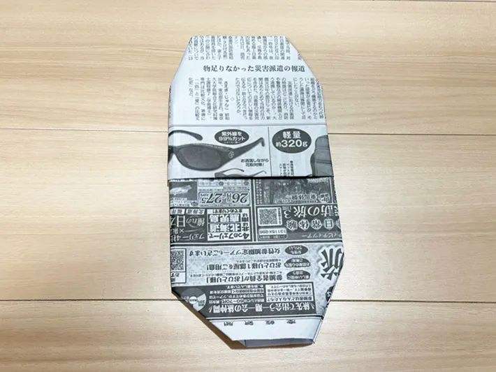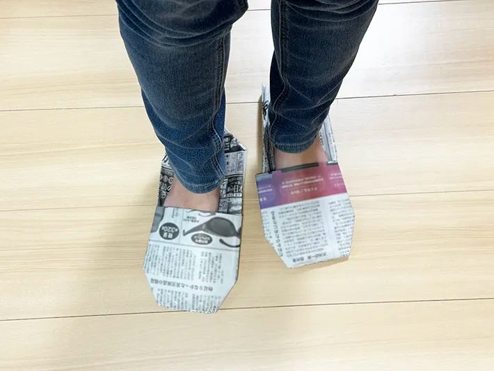 裏返して形を整えれば、新聞紙スリッパの完成!