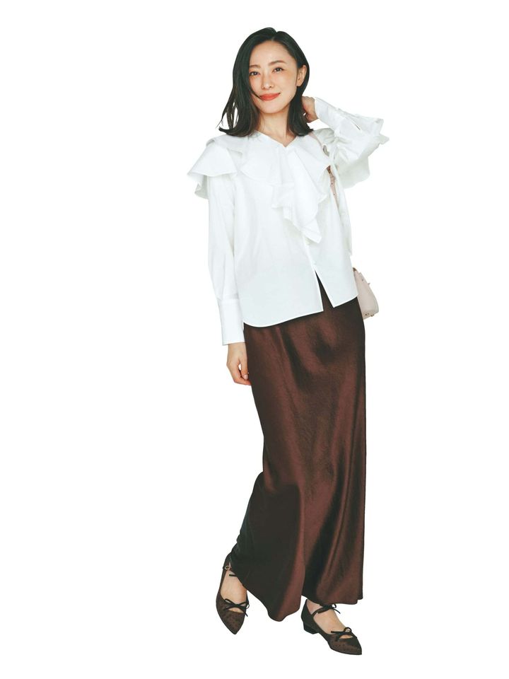 ブラウス¥19,800(DAY by DAY it’s international)スカート¥25,300(カデュネ/カデュネ プレスルーム)バッグ¥31,900(トーヴ/アンソロジー)シューズ¥17,600(ダイアナ/ダイアナ 銀座本店)