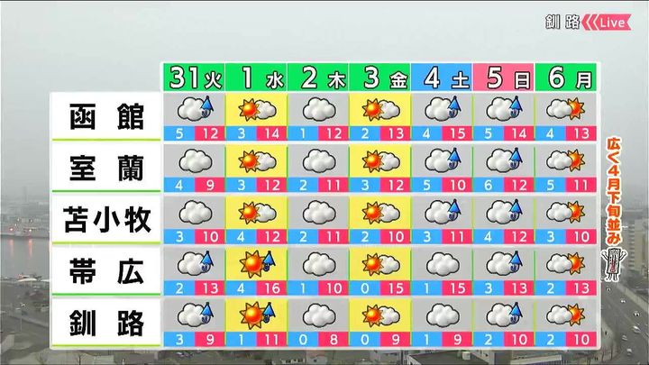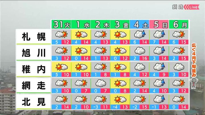 4月のスタートは晴れて、札幌や旭川は14度まで気温が上がります。その後も金曜まで大きな崩れはないですが、土日は広く雨が降るでしょう。