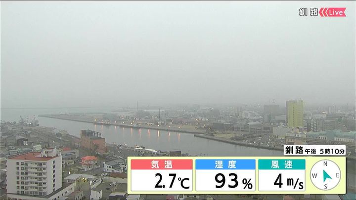 釧路は低い雲がかかっています。今夜は濃い霧に注意して下さい。また、冷たい海風の影響で、寒くなっています。