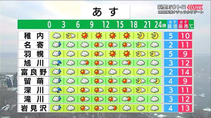 太平洋側は低い雲や霧がかかり、夜は広尾や釧路などで雨が降るでしょう。オホーツク海側は晴れる見込みです。気温は高く、帯広13度、北見14度はともに4月下旬並みです。