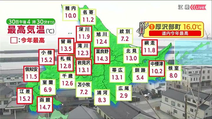 きょう30日(月)午後4時半までの最高気温です。広く4月中旬から下旬並みで、最も上がった檜山南部の厚沢部町は16.0度。道内で今年初めて15度を超えました。小樽や画面の江差も15度超え、赤枠の札幌12.8度、函館14.7度は今年一番の暖かさでした。一方、日中でも霧がかかった十勝の広尾町は、2.9度と寒くなりました。