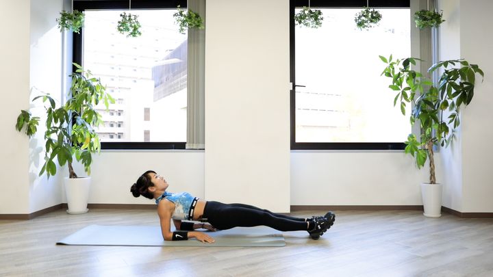 まずはベーシックなプランク。肘とつま先で体を支えて、腹筋に力を入れてフォーム維持してください。