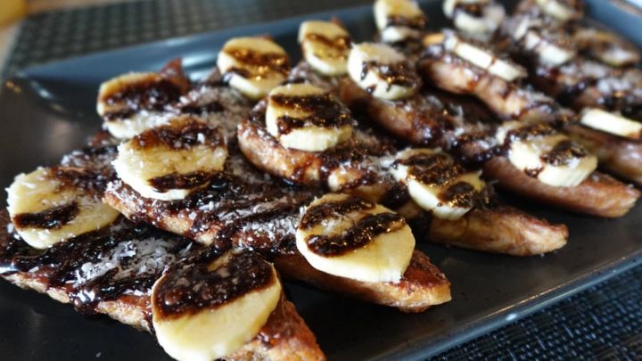 フィリピンでは「ヌテラ」(ヘーゼルナッツとココアをベースにした濃厚なスプレッド)が大人気。バナナヌテラトーストは120ペソ(約¥316)