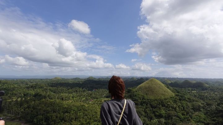 続いて向かったのは、名所としても有名な【チョコレートヒルズ】。円錐形の丘が1,000以上も連なる、ボホール島を代表する景勝地。チョコレートの丘? と疑問に思った方も多いはず。写真では青々とした草木が生い茂っていますが、乾季には草が枯れ、丘がチョコレート色に見えることから、この名が付いたそう。