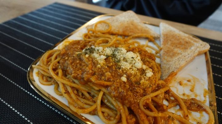 パスタに添えられているパンが甘い! フィリピンカルチャー、おそろし! トマトボロネーゼパスタは199ペソ(約¥525)
