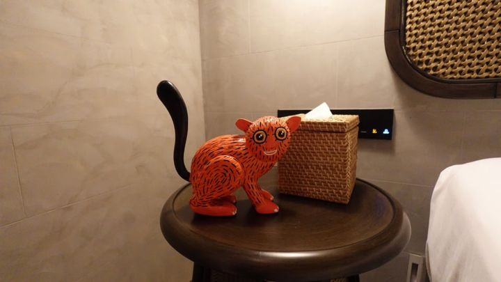 ベッドサイドにはボホール島の名物、メガネザルのターシャが。
