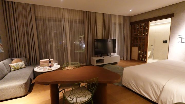 エントランス奥にはプールや海が広がっているのですが、チェックインが夜だったため残念ながらこのタイミングでは見られず。でも、ライトアップされた風景がなんともロマンティックな雰囲気に包まれていました。