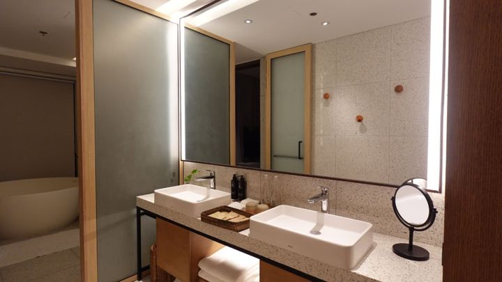 今回ステイしたのは、プライベートプール付きのヴィラタイプ。部屋に一歩入ると、中庭からプール、さらに外の緑へとシームレスにつながる設計が印象的。大きなバスタブや充実したアメニティも、日本人には嬉しいポイント。
