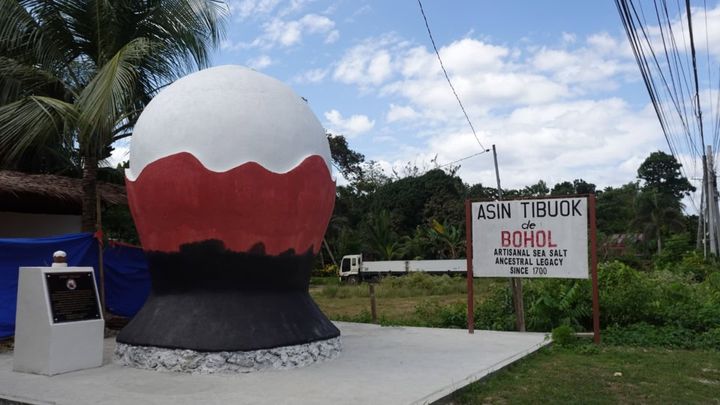 販売所の隣には、立派なオブジェも。文献によるとスペイン統治が始まった16世紀ごろには塩の生産が始まっていたそうですが、ずっと以前から作られていた可能性も十分考えられるそう。