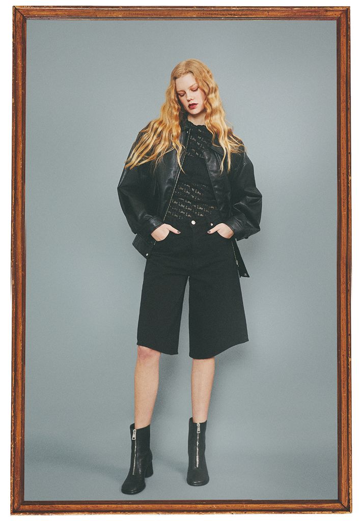 繊細な仕立てが黒のレザー&デニムのハードさを軽減