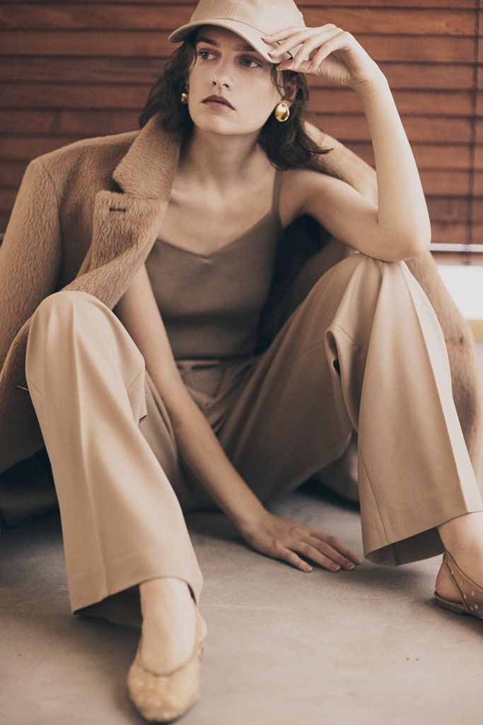 ベージュ系の穏やかな配色は、レザーの帽子でキレを出すことで、顔の印象までぼやけずに済む。つばが長すぎないことで個性を緩和でき、キレイめな服にもなじみやすい。