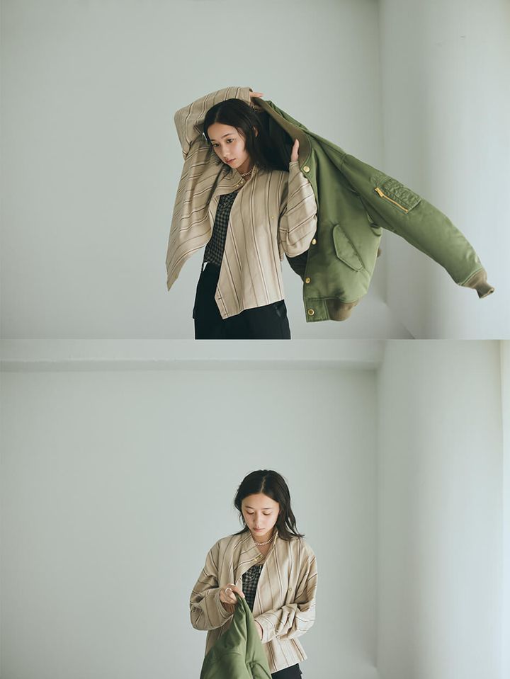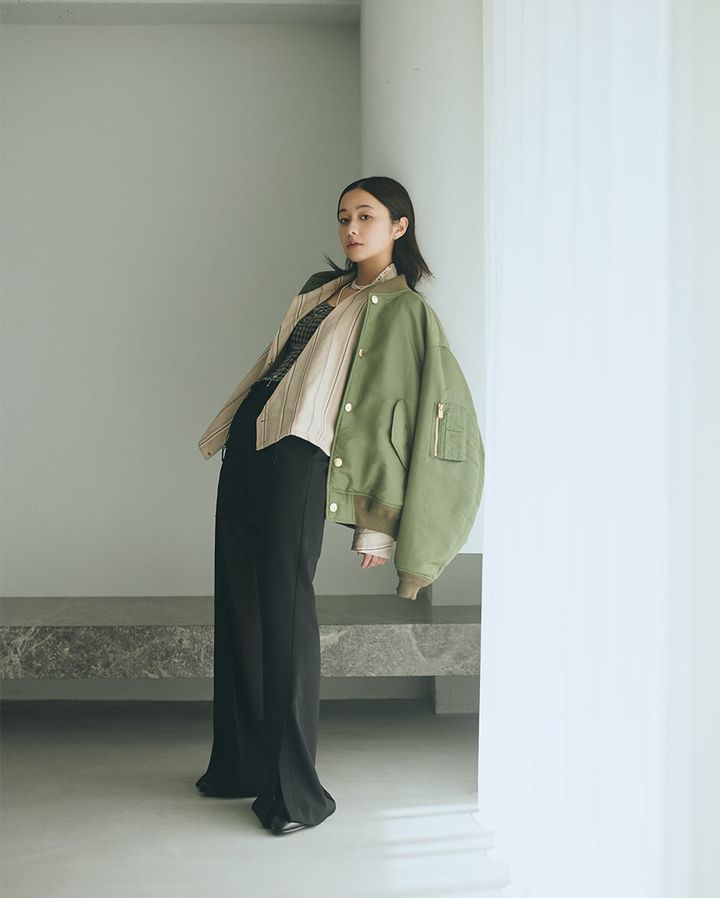 bomber jacket ¥121,000 and striped jacket ¥82,500 by TATRAS TATRAS CUSTOMER CENTER,bustier ¥38,500 by ERIKOKATORI MOUR,trousers ¥45,100 by AOIWANAKA,boots ¥162,800 by CALMANTHOLOGY,long necklace ¥44,000 and short necklace ¥28,600 by MAYU MAYU SHOWROOM,ring ¥17,050 by SOIERIE