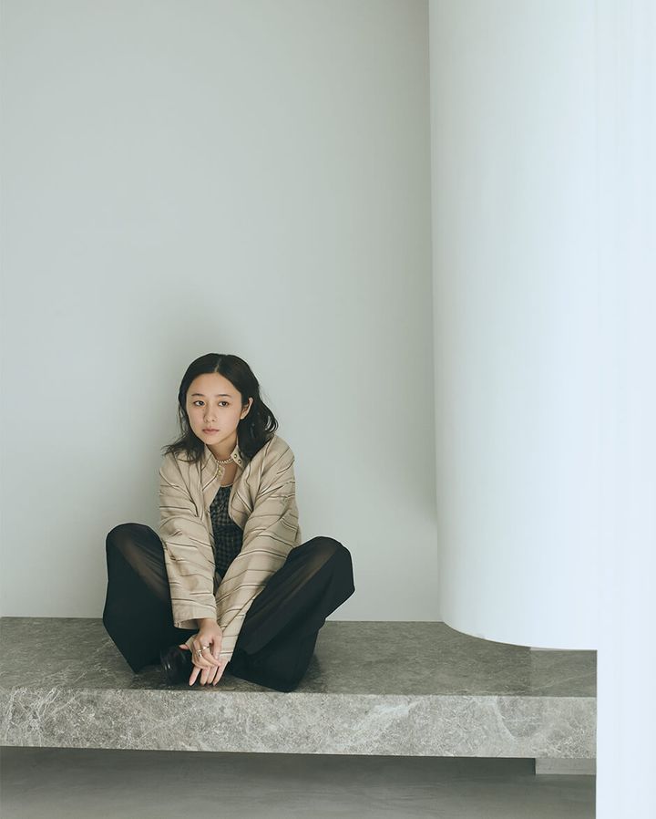 jacket ¥88,000 by TATRAS TATRAS CUSTOMER CENTER,shorts ¥36,300 by EQUALMENT,shoes ¥129,800 by CALMANTHOLOGY,vintage collar ¥18,480 by TORO,necklace across the body ¥44,000 by MAYU MAYU SHOWROOM,ring ¥14,300 by SOIERIE,vintage gloves ¥4,410 by JEANNE VALET
