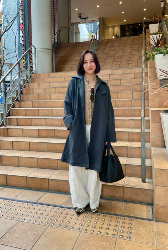 メンズアイテムやオーバーサイズのアイテムを絶妙に着崩したスタイルの中に、大人の余裕や品が溢れていました。ゆったりとしたシルエットだからこそ、こなれ感がさらに引き立つ素敵なスタイリングですね!