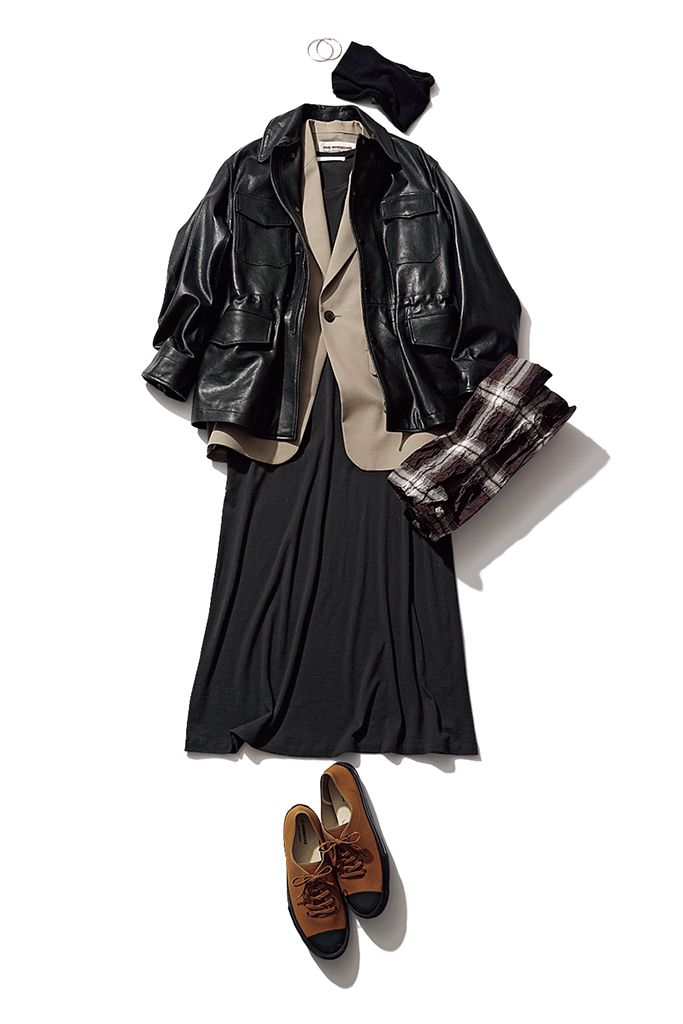 ベージュジャケットは着まわし。黒レザージャケット/LOEFF(エイチ ビューティー&ユース) 中に着たワンピース(4月発売)/プレインピープル(プレインピープル青山) ヘアバンド/CA4LA(CA4LA プレスルーム) ピアス/Kenneth Jay Lane(ZUTTOHOLIC) チェックバッグ/COS(COS 青山店) スニーカー/MOONSTAR(ムーンスター カスタマーセンター)
