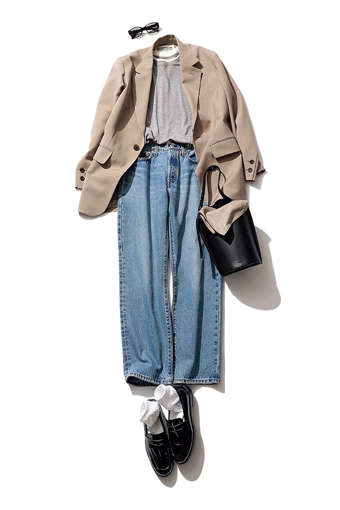 ベージュジャケットは着まわし。グレーTシャツ/MEILLEUR MOMENT(THIRD MAGAZINE) デニムパンツ/リーバイス®(リーバイ・ストラウス ジャパン) サングラス/Ray-Ban(ルックスオティカジャパン カスタマーサービス) バッグ/マロウ(プレインピープル青山) ソックス/靴下屋(タビオ) ローファー/CHARLES & KEITH(CHARLES & KEITH JAPAN)