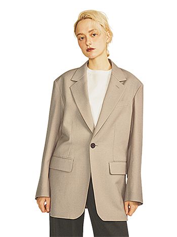 肩パッドにより輪郭が立体的になり、羽織るだけで体の華奢見せがかなう。かっちりとしたシルエットでも力みすぎないよう、淡いベージュの柔和な色をチョイス。