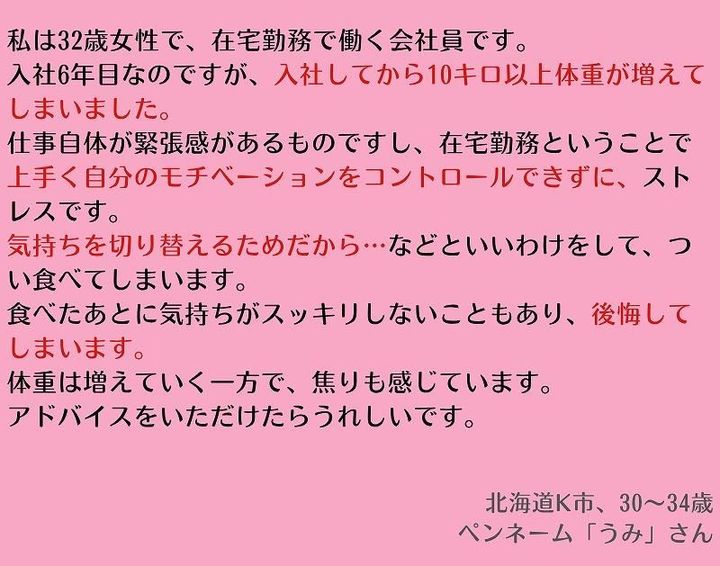 読者からのお悩み「在宅勤務で体重が増えちゃったり。どうしよう…」