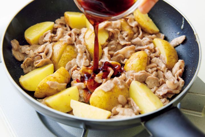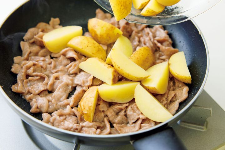 (2)フライパンにサラダ油を中火で熱し、豚肉を入れて炒める。色が変わったら、新じゃがいもを水けをきって加え、全体に油が回るまで炒める。
