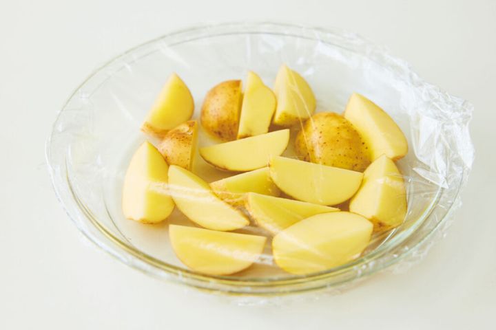(1)新じゃがいもはよく洗い、皮つきのまま縦4等分に切る。水にくぐらせてから耐熱皿に並べ入れ、ふんわりとラップをして電子レンジ(600W)で4分加熱する。豚肉は幅1cmに切り、塩、酒をふってもみ込み、片栗粉をふってさらにもみ込む。〈A〉は混ぜる。