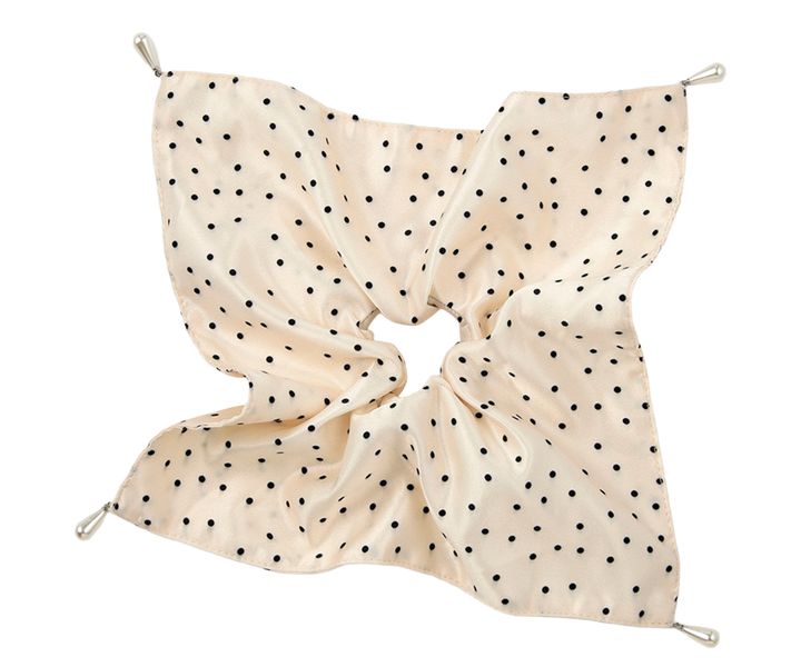 ひらっとした動きがおしゃれなスクエアシュシュ。細かいドット柄がレディな印象。シュシュ ¥2,090 (GOLDY)