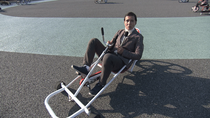 名取市サイクルスポーツセンターではユニークな自転車に乗りながら、2006年に「事件です」のフレーズが誕生したきっかけを紹介。意外にも、自分発信ではなくて…!?
