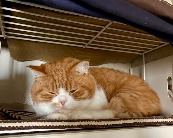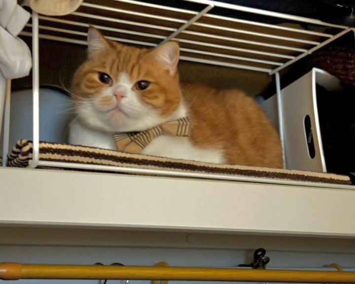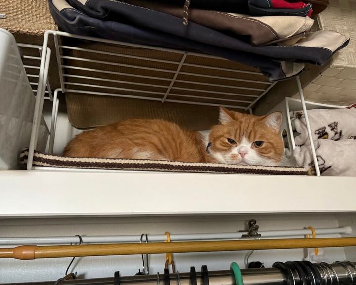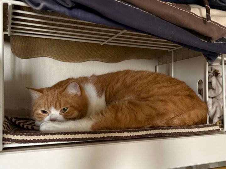 高い所が好きだから、クローゼットの棚の上だよ。