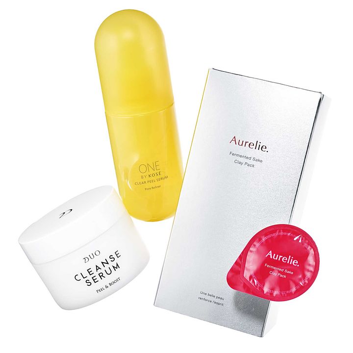 ゴワつきもくすみもオフ。(左から)古い角質をゆるめてターンオーバーを正常化。スキンケアが浸透しやすい肌に。デュオ クレンズセラム ピール&ブースト 90g ¥4,620()洗顔後にさっと拭き取るだけで毛穴づまりを一掃。角栓の元ができにくい肌に。ONE BY KOSÉ クリアピール セラム 120㎖ ¥3,850〈編集部調べ〉()5種の天然クレイが毛穴の奥の汚れを吸着。酒粕で肌にツヤとうるおいを。発酵酒粕クレイパック7g×4個 ¥2,640(.)