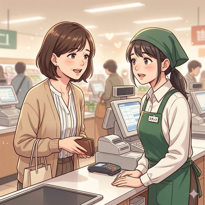私が心の中で逡巡していると、お釣りを受け取った女性客が、ふいにお財布をしまいながら店員さんに話しかけました。