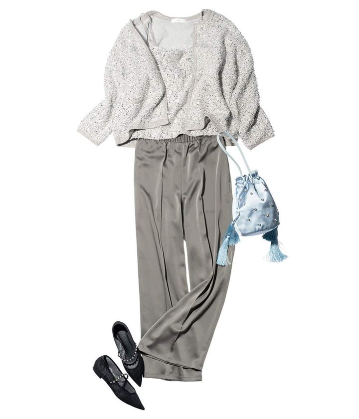 カーディガン¥42,900キャミソール¥31,900(ともにebure/リトルリーグ インク)サテンパンツ¥7,990(PLST)バッグ¥25,300(ツル バイ マリコ オイカワ)パンプス¥9,900(チャールズ&キース/チャールズ&キース ジャパン)