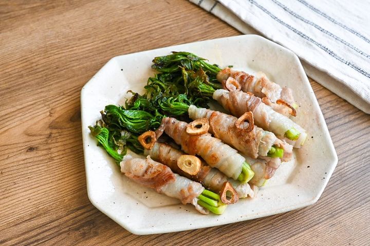 アクが少なく爽やかな香りのコシアブラを、ガツンとニンニクを効かせた豚バラ肉で巻いたボリューム満点のひと品。茎にだけお肉を巻くことで、葉の軽い食感と旨みが際立ちます。