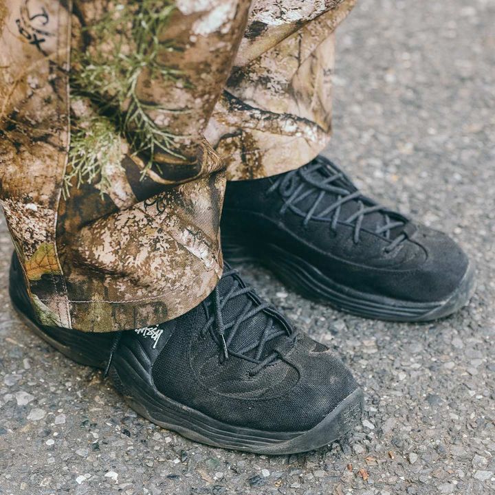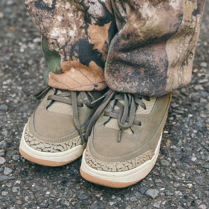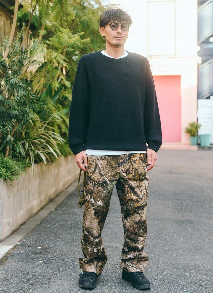 カーキのスニーカーとリアルツリー柄ボトムスの組み合わせがアウトドアムード満点。絶妙カラーバランスでこなれ感漂う足元の完成!