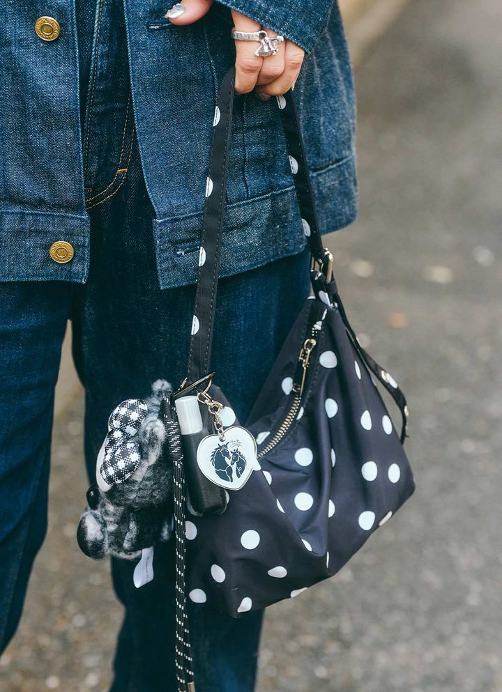 いまトレンドのドット柄はバッグで投入。チャームやぬいぐるみキーホルダーもモノトーンで揃えて、統一感アップ!