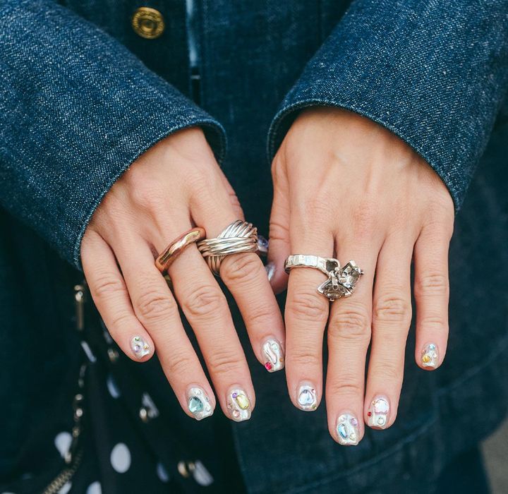 存在感あるリングの重ね付けで、コーデにスパイスをひとふり。カラフルなストーンを散りばめた、アート感あふれる指先も要チェック♪