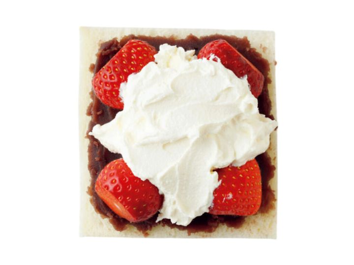 (1)食パンではさむ いちごはへたを取り、食パンはみみを切り落とす。2枚にあんこを等分に塗り広げ、いちごを中央と4つの角に等分にのせる。マスカルポーネチーズを等分にのせ、残りの食パンではさむ。