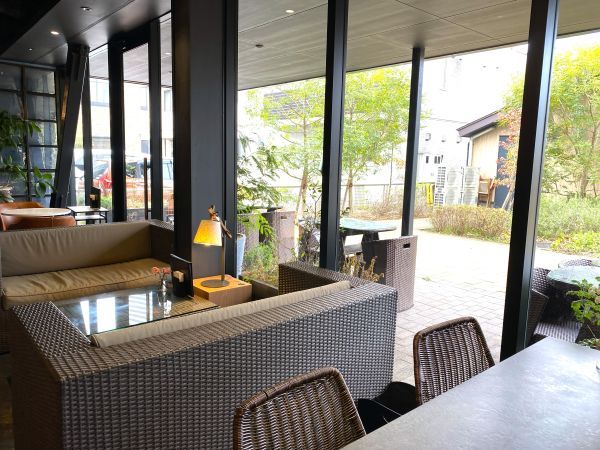 暗めの色調の落ち着いた内装で、植物があちこちに置かれています。店内の緑や庭の植栽は、提携のフラワーショップが手がけているとのこと。