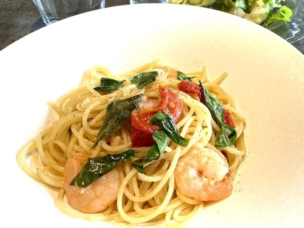 えびとバジルのペペロンチーノ