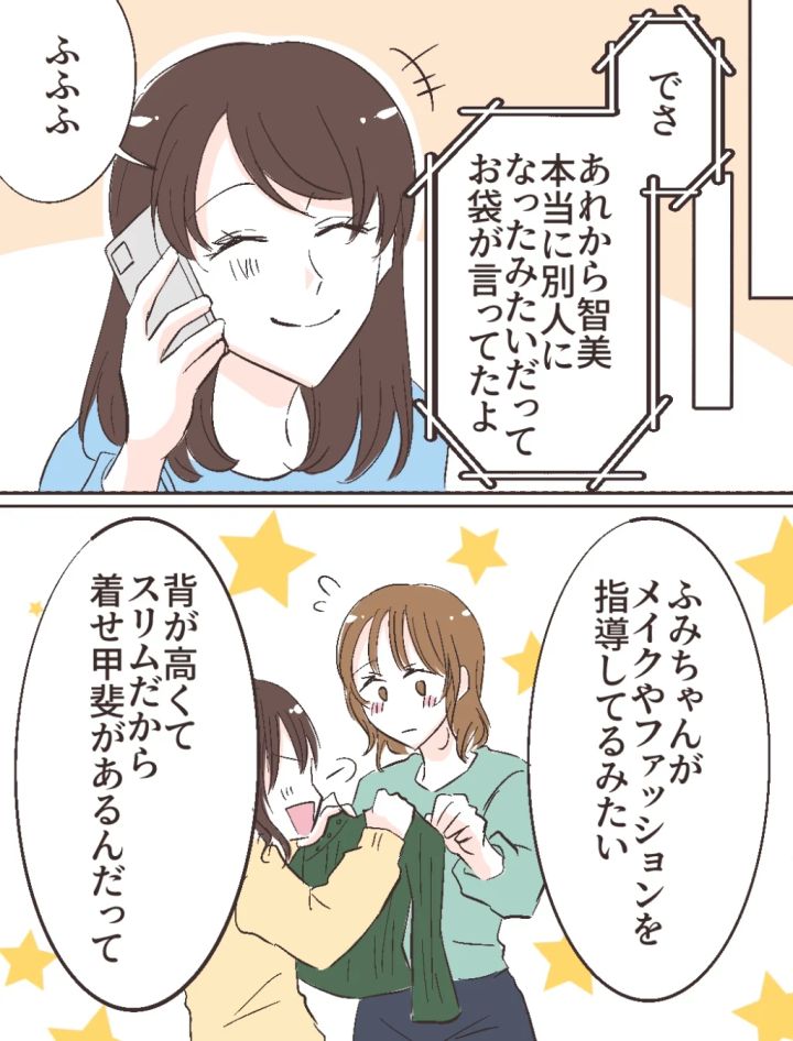その後、あやのさんが修吾さんと電話で話していると、「でさ、あれから智美、本当に別人になったみたいだってお袋が言ってたよ」その言葉を聞いて「ふふふ」と笑うあやのさんが、「ふみちゃんがメイクやファッションを指導してるみたい。背が高くてスリムだから、着せ甲斐があるんだって」と言うと、