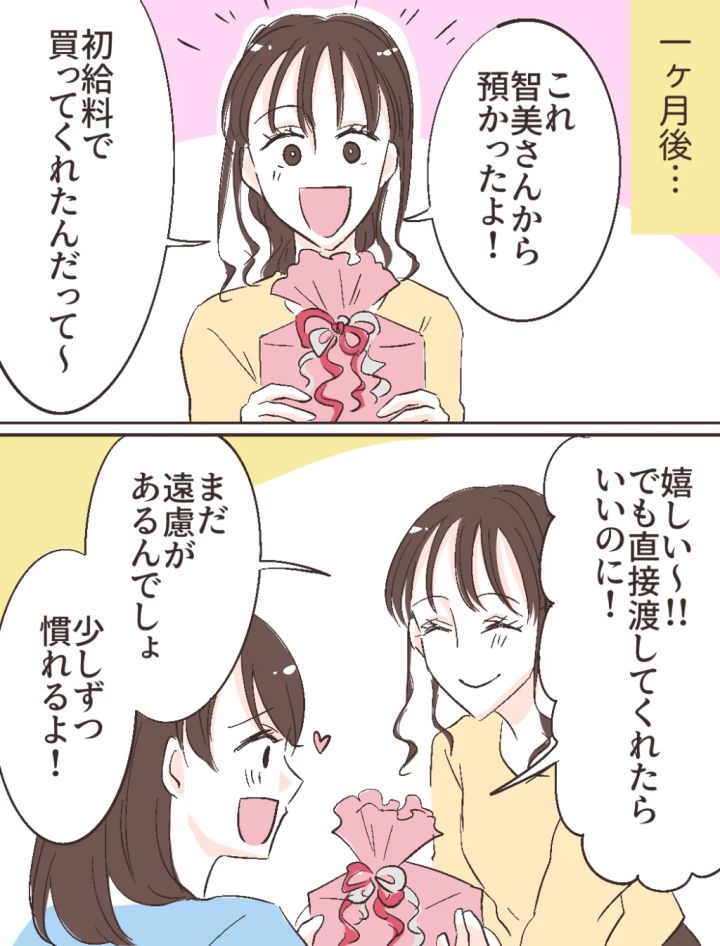 「これ智美さんから預かったよ!初給料で買ってくれたんだって~」とふみのさんに託された智美さんからのプレゼントを受け取ったあやのさんが「嬉しい~!!でも直接渡してくれたらいいのに!」と言うと、「まだ遠慮があるんでしょ。少しずつ慣れるよ!」と答えるふみのさん。