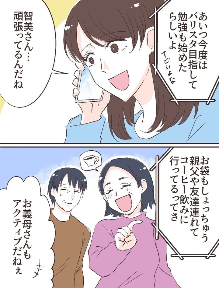 「あいつ今度はバリスタ目指して勉強も始めたらしいよ。すごいよな」関心する修吾さんの言葉に、「智美さん‥頑張ってるんだね」とあやのさんが言うと、「お袋もしょっちゅう親父や友達連れてコーヒー飲みに行ってるってさ」「お義母さんもアクティブだねぇ」修吾さんの言葉から義母が楽しそうに智美さんのもとを訪れる様子が浮かんできました。