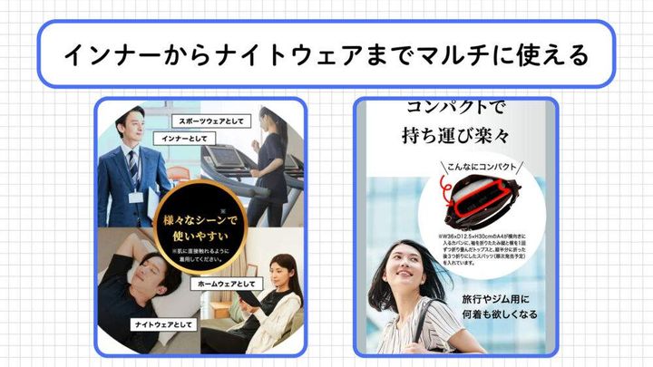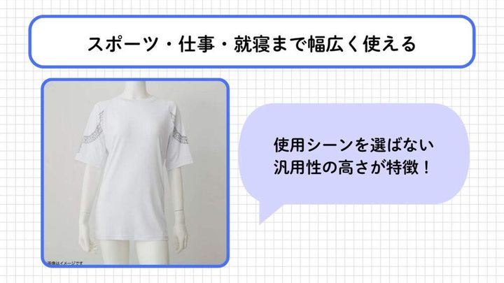 締め付け感のない伸びやかな着用感なので、スポーツウェアとしてもインナーとしても、就寝時のナイトウェアとしても幅広く使えるのが嬉しいポイントですね。その際には肌に直接触れるように着用することが推奨されています。